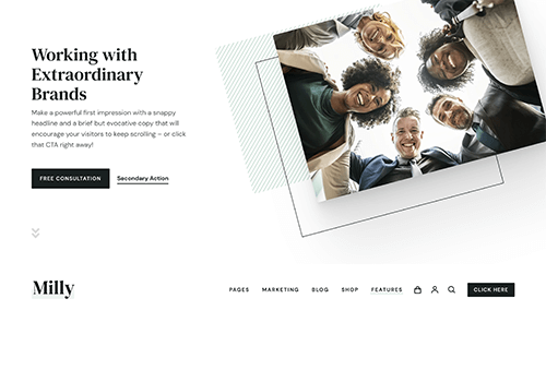 Milly is truly versatile. It comes with three homepage designs: for freelancers and entrepreneurs who offer their own services, for larger businesses and agencies, and finally, an ecommerce homepage suited for an online shop. The eclectic variety of pages Milly includes allows for building a complete website for each type of brand, even with the most demanding needs.